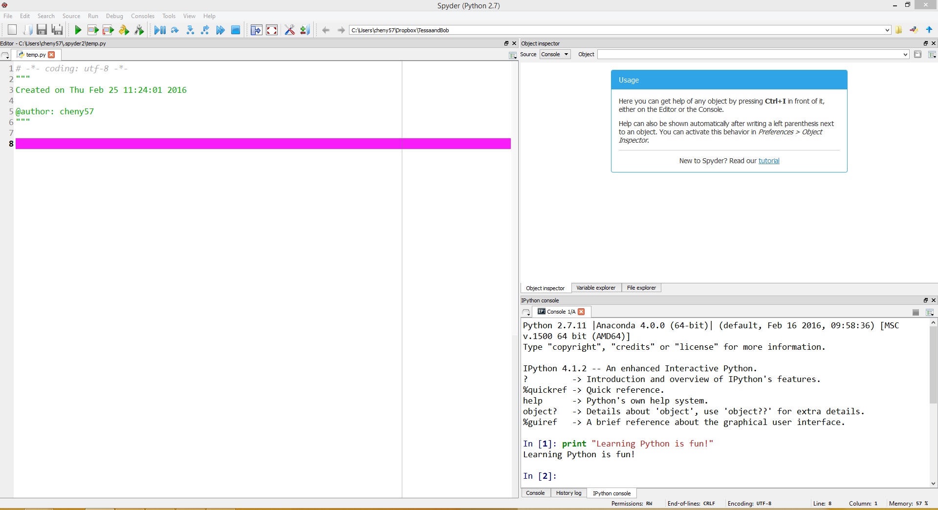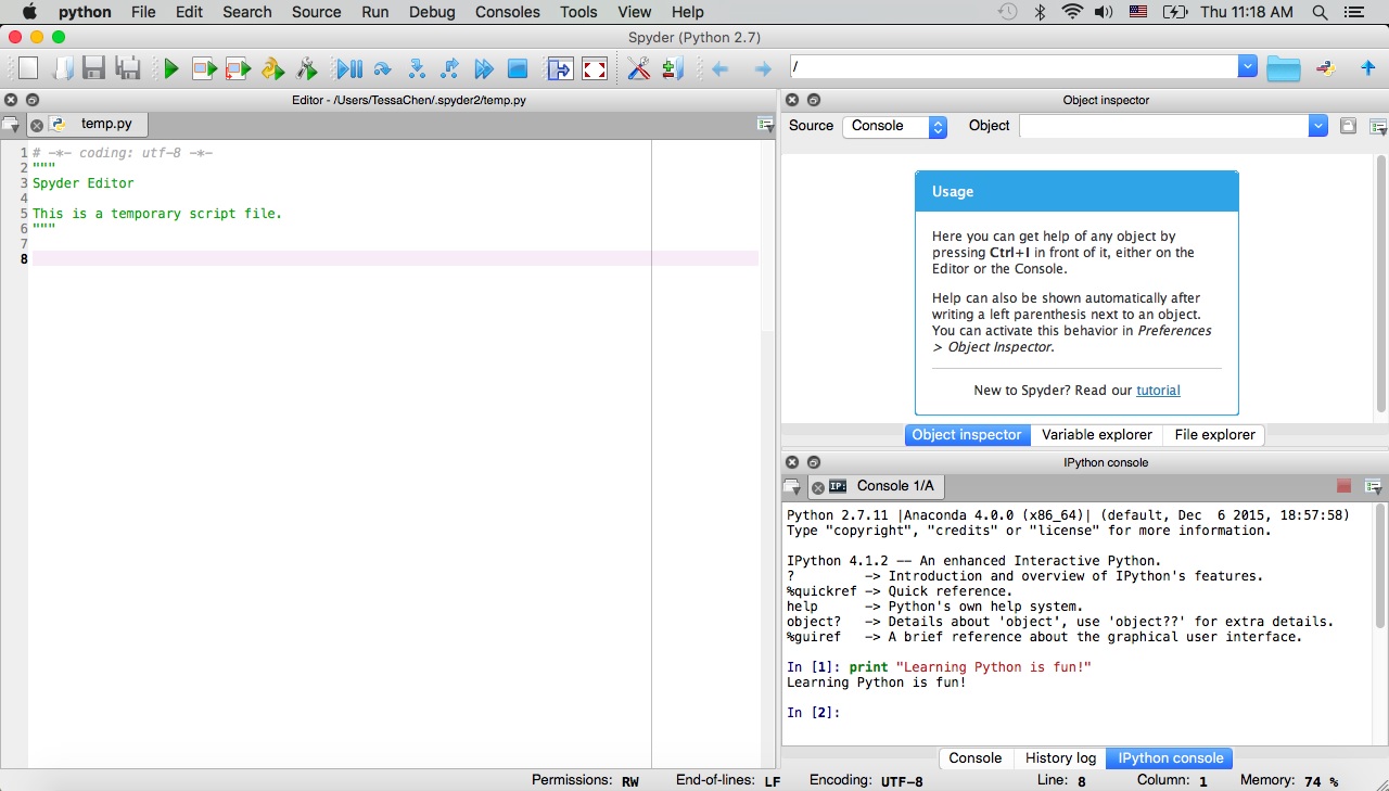 Now, type print “Learning Python is fun!” in the Console 1/A (IPython console) located in the lower right of the interface. Click the "Enter" key and the text should appear printed in the Console just under your executed command.