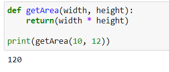 The parentheses contain what are called parameters. These are the variables that are input into the function that contribute to the final output. Parameters are not always required; depending on the function, they can include anything from integers and strings to other functions. Let us create a simple area calculating function to get used to the syntax.