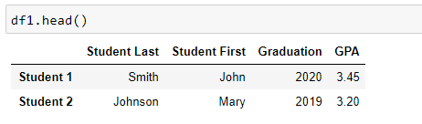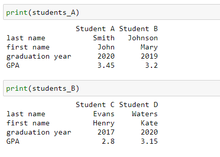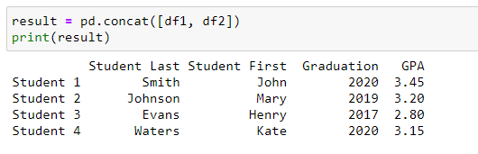 Concatenating two dataframes in python is essentially forcing the two sets to combine either vertically or horizontally. If the datasets have the same column headers, then it will group the data from each set into its respective column. Below we combine the records for four students.