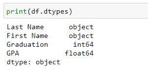 When working with data in python it’s good practice to change dates to datetime and sometimes a column of values from strings. To see the data types: print(<df>.dtypes)