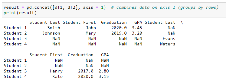 However, if you would like the data to be grouped side-by-side, then specifying “axis = 1” in the concatenation function will simply put the second dataset to the right of the first.