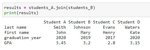 The join method combines data sets that share the same indexes (row headers). In the example below, both data sets have the same four indexes so they are able to be combined into one set, resulting in vertically-oriented student records.