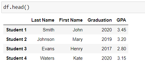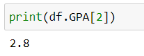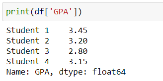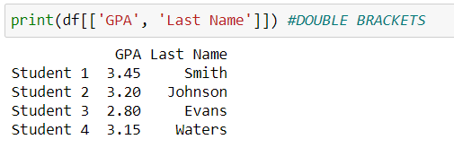 From this output you see that it gives us our student index and their gpa’s. To get one column the syntax is df[‘<column>’] for multiple columns you’ll have to use a list therefore it would look like df[[‘<column>’, ‘<column>’]]. Two brackets are required.