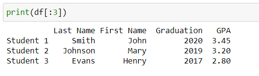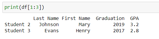 Selecting parts of columns and rows instead of all of the values is a tad more complex. Let’s start by only selecting the first three out of four student records. You do so using the following syntax: