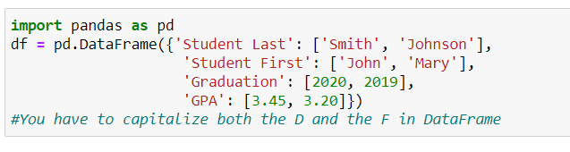 To create a dataframe you must first create a dictionary. A dictionary is a list of values linked to keys. The keys are separated from their values with colons and brackets as shown below. In this case, the dictionary keys will become the column names for the DataFrame. The key would be “Grades” and the values would be “A, B, C, D, F”.
