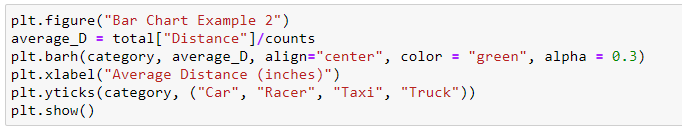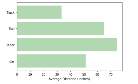 In the following example, we study the distribution of average distance that each type of vehicles covered and create a horizontal bar chart by using the Python function plt.barh().