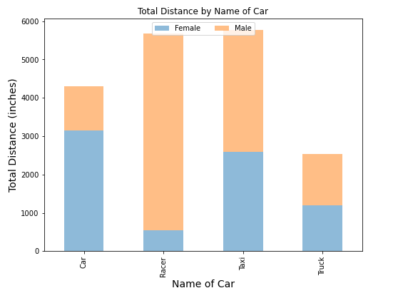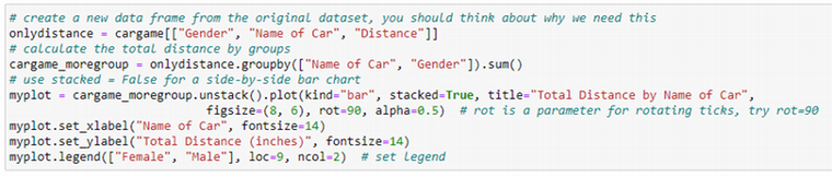 In the following example, we study the stacked bar chart for the total distance grouped by two variables: Name of Car and Distance. Here we use the plot() function in the module Pandas. In the legend method, we use two parameters: loc and ncol.
