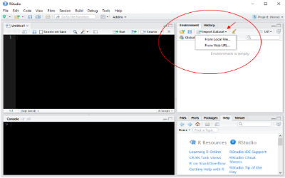 As pictured below, there are 4 different parts in the Rstudio display - you will find the Import Dataset icon in the Environment window located in the top right: