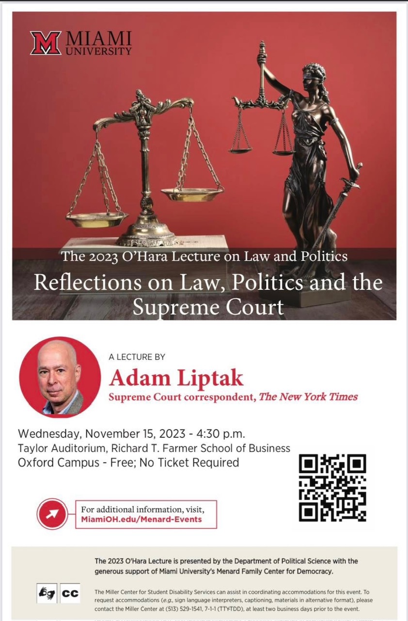 The University's annual O'Hara Lecture on Law and Politics -- Adam Liptak, the New York Times Supreme Court correspondent, will discuss the Court's recent decisions and the role of the judiciary in American politics and law.