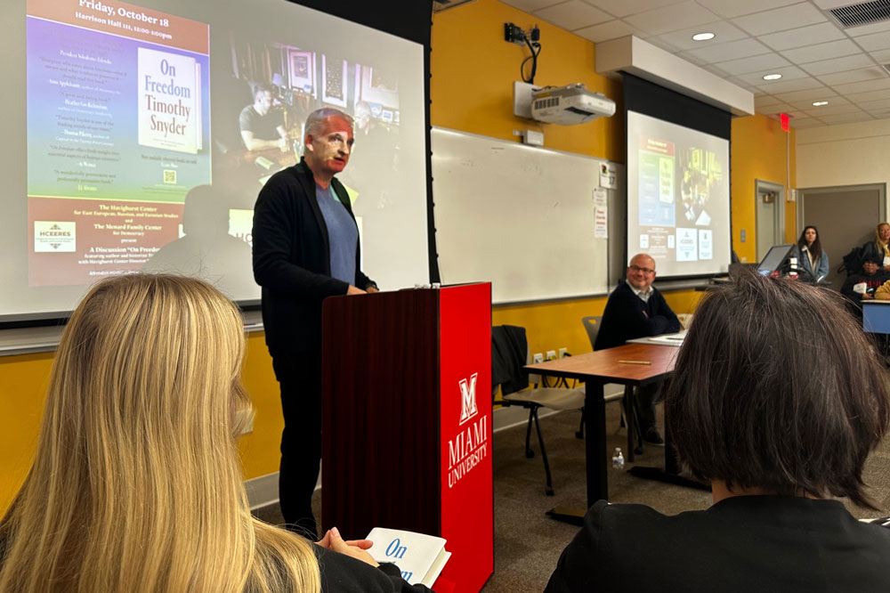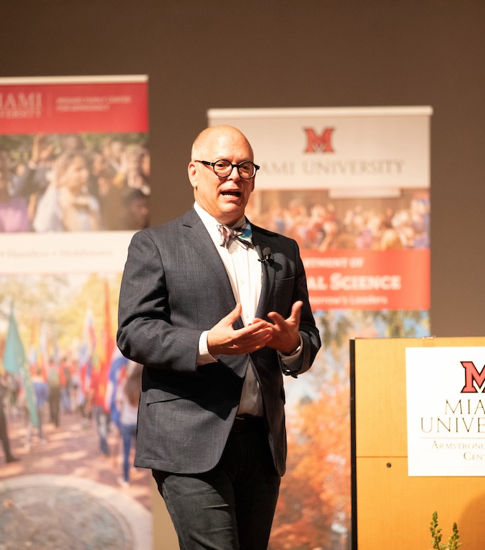In this public event hosted by the Menard Family Center’s John Forren, Mr. Stelter delivered a lecture entitled “The Role of the Media in American Democracy” and answered questions from attending Miami students, faculty, staff and community members. Mr. Stelter also met in advance of his public lecture with a group of Miami student journalists.