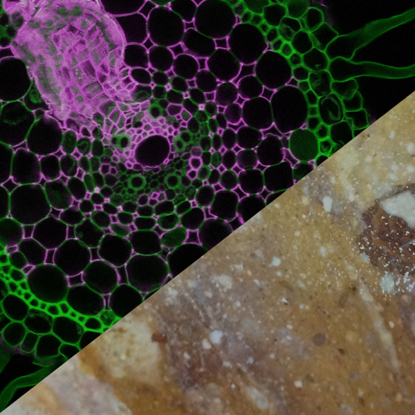 A cross-section of the center of a young root that opened up an air channel within 24 hr of its being flooded. The antibody-linked fluorescent stains reveal differences in the composition of the cell walls.
